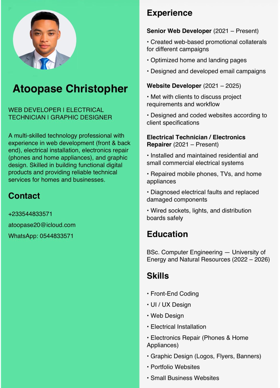 Hi, I'm Chris Atoopase — a certified Computer Engineer with a passion for technology and a commitment to quality service. Since founding Technoid, I've been on a mission to bring professional-grade tech solutions to Kumasi, Ghana.
